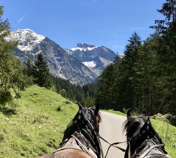 Gerne organisieren wir für Sie eine romantische Kutschenfahrt bei der Oberstdorfer Lohnkutscherei Blattner . Die Kutsche fährt dann direkt am Chaletdorf vor.